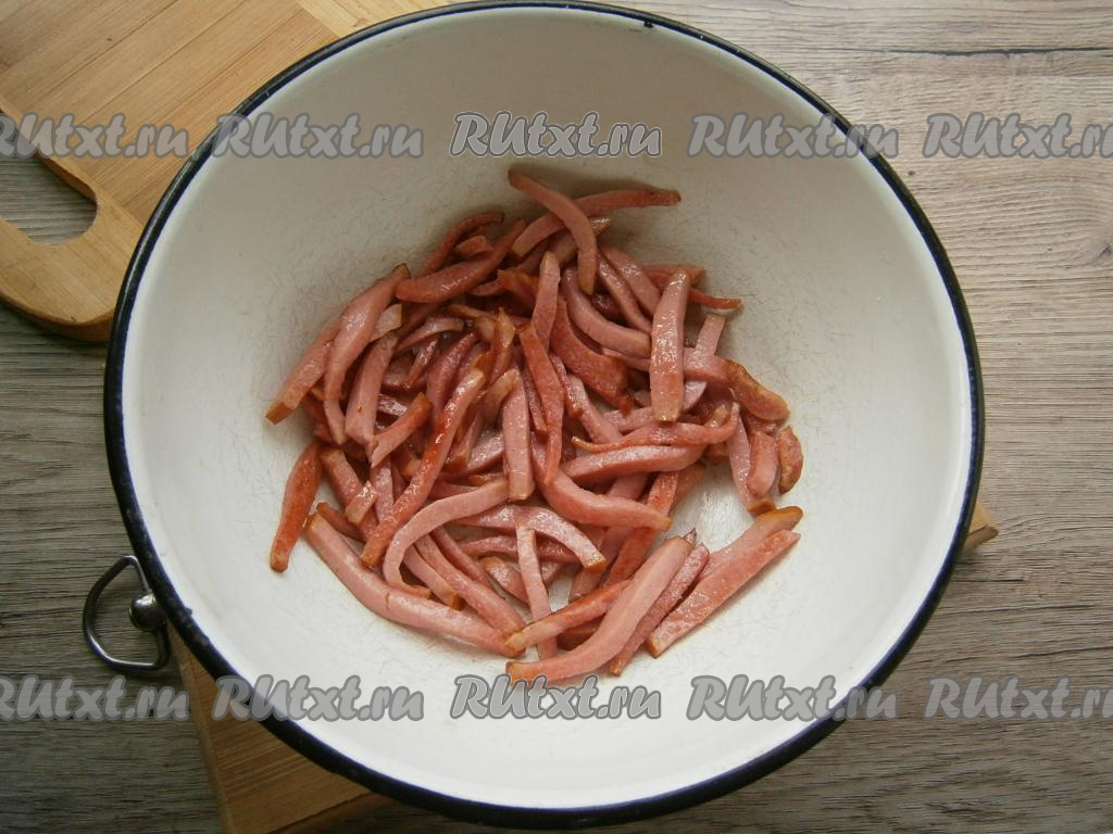 Если готовите салат с вареной колбасой, тогда обжарьте её на растительном масле до легкой румяности со всех сторон и остудите. Копченую или полукопченую колбасу можно не обжаривать.