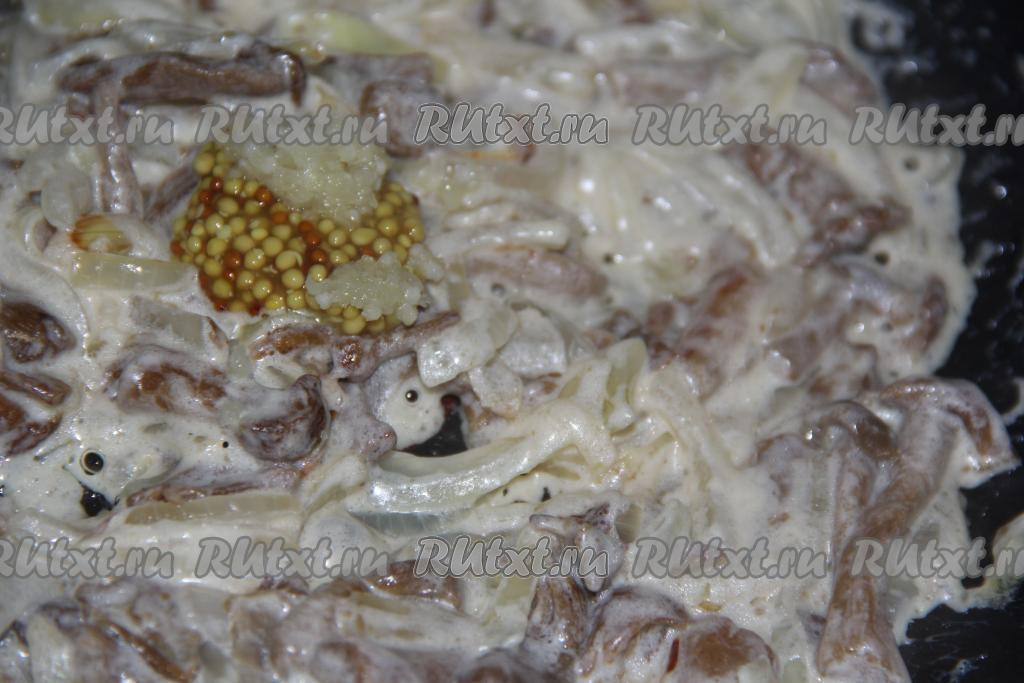 Тушить грибы в сметане минут 10, затем добавить чеснок, пропущенный через пресс, и зерновую горчицу (по желанию), перемешать и снять начинку с огня.