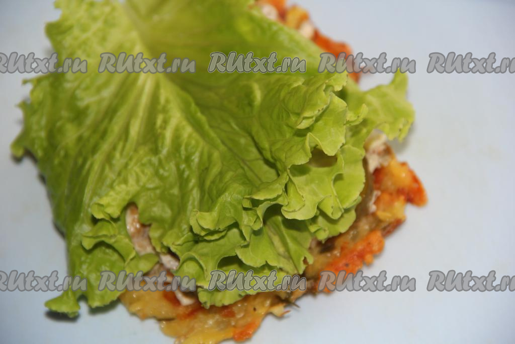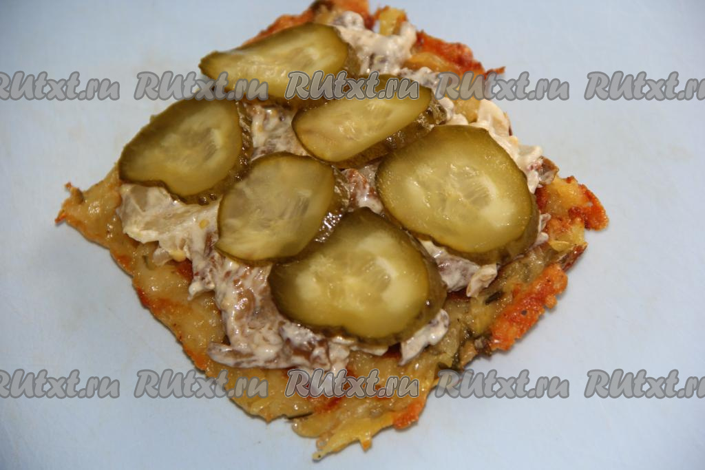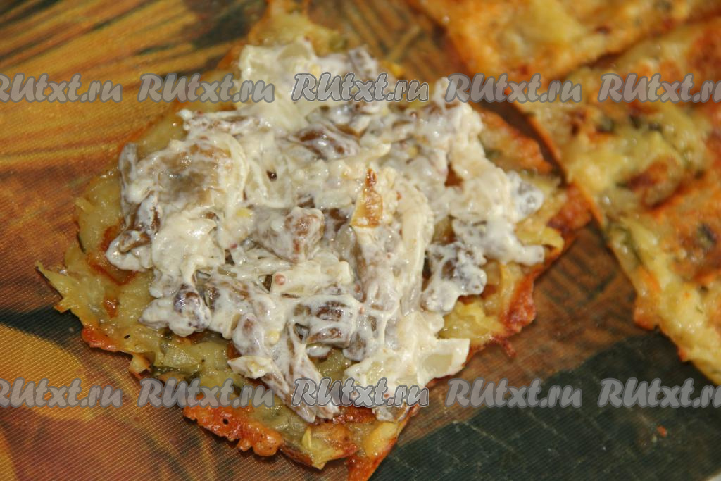 Сформировать "бургер": на драник выложить часть грибной начинки.