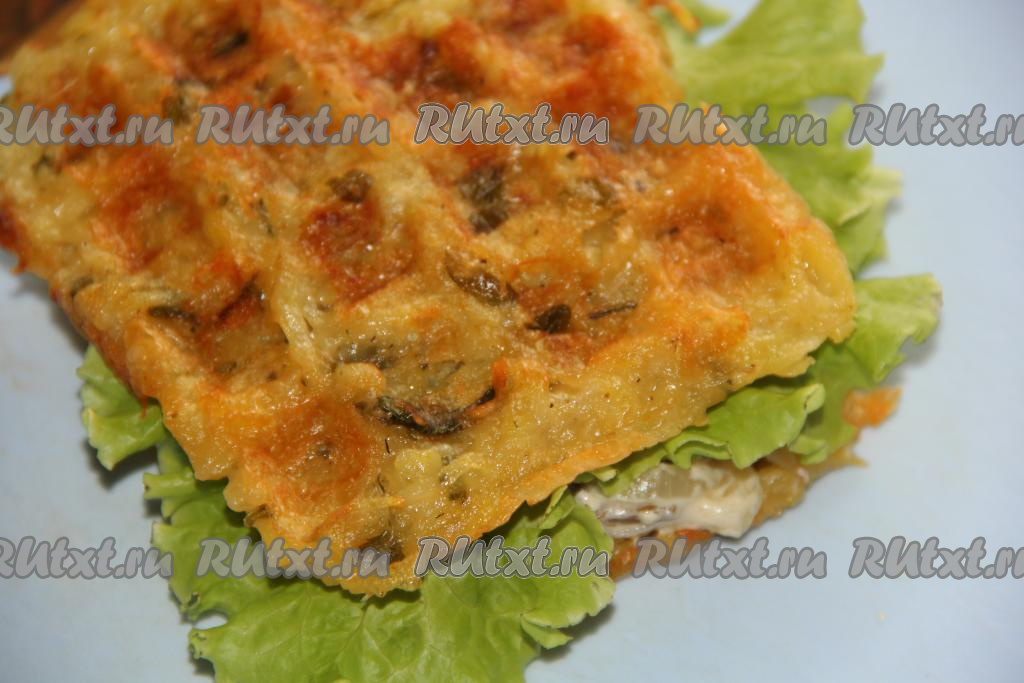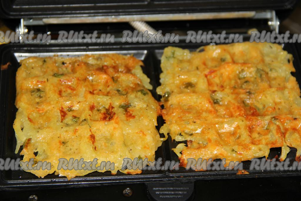 Вафельницу хорошо разогреть и смазать растительным маслом. Выложить по 2 столовые ложки картофельной массы на каждую сторону и равномерно распределить по поверхности.