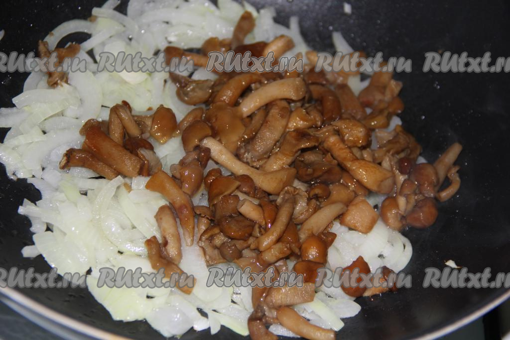Для начала я приготовила начинку. Лесные грибы (у меня замороженные опята) отварить в воде в течение минут 15, затем откинуть на дуршлаг. Лук очистить и нарезать тонкими полукольцами. Обжарить лук в сковороде с добавлением растительного масла до золотистого цвета, иногда помешивая, затем добавить грибы. Если будете готовить с вешенками или с шампиньонами, то можете их не отваривать, а сразу добавить к обжаренному луку.