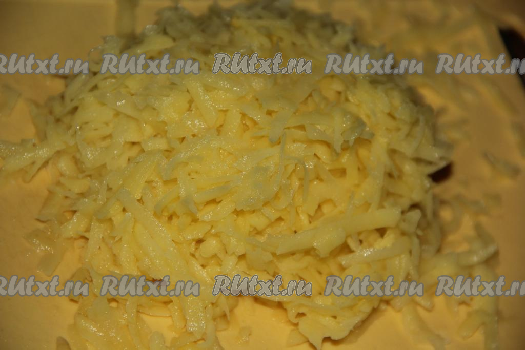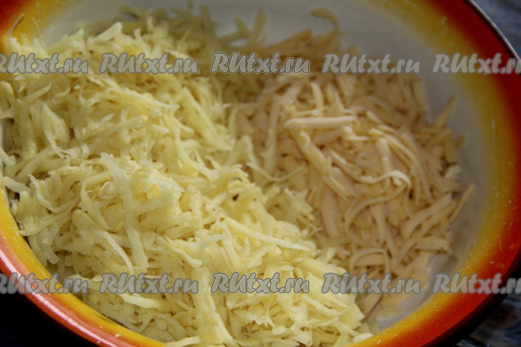 Теперь займемся драниками. Сыр натереть на крупной тёрке.