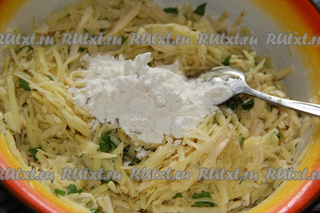 Картофель очистить и натереть на крупной тёрке. Натёртый картофель отжать, чтобы удалить лишний сок.