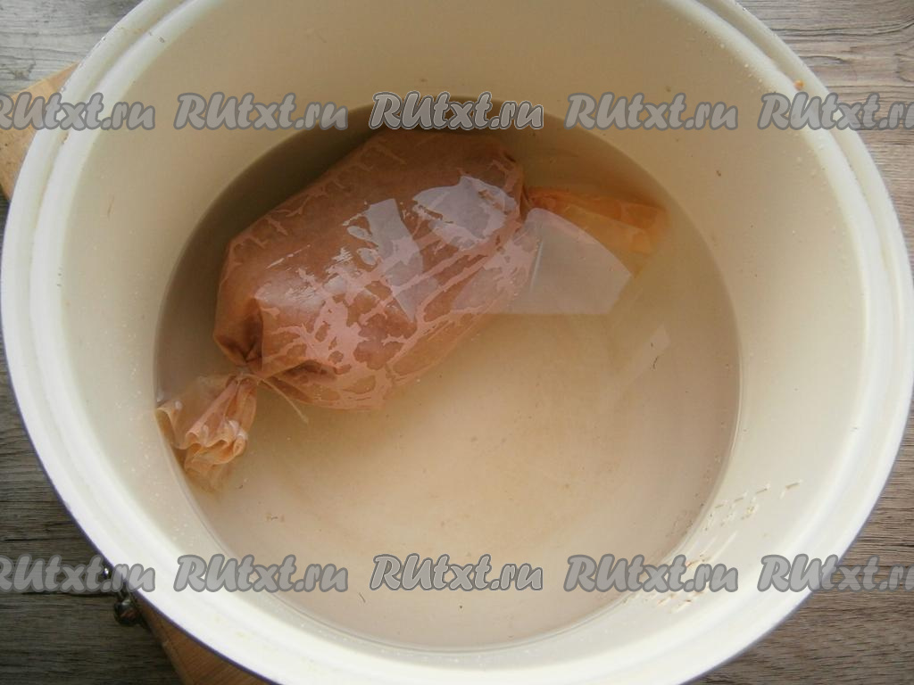 Поместить оболочку с фаршем в холодную воду, налитую в чашу мультиварки (вода должна полностью покрывать оболочку). Выставить режим "Мультиповар" на 83 градуса, время готовки - 2,5 часа. Если будете готовить колбасу в пакетах, тогда их нужно наполнить фаршем, тщательно завязать с двух сторон, поместить пакеты в кастрюлю с холодной водой, после закипания воды убавить огонь. Варить домашнюю печеночную колбаску можно часа 2 при самом слабом кипении.