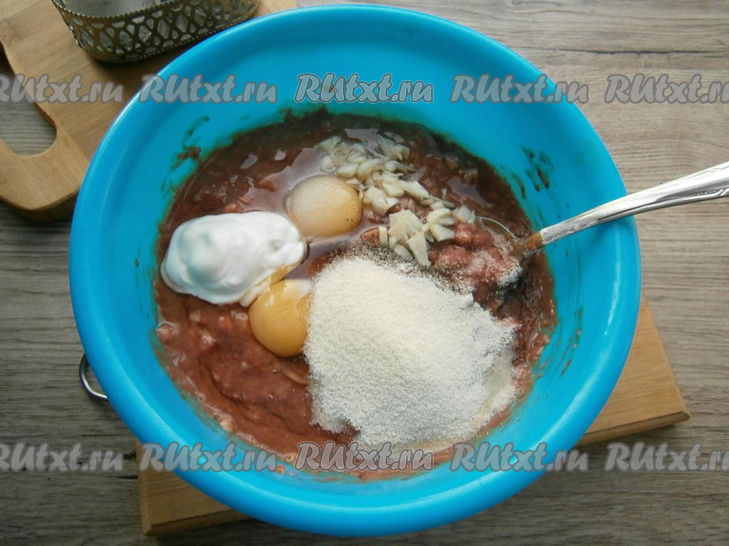 Также добавить сметану, измельченный чеснок и манную крупу.