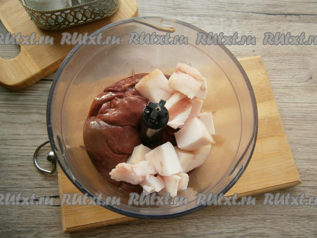 Печень вымыть, обсушить, поместить в чашу блендера. Добавить половину сала, нарезанного кусочками.