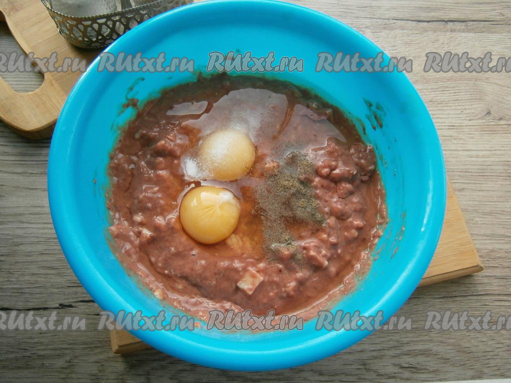 К фаршу с салом добавить сырые яйца, соль и черный молотый перец.