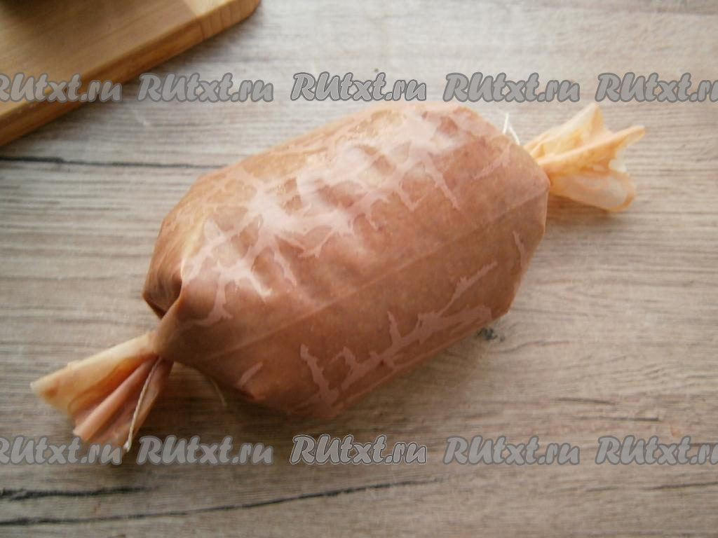 Наполнить коллагеновую оболочку (любого диаметра) печеночным фаршем, крепко перевязав края с двух сторон. Наполнять оболочку фаршем следует не плотно!