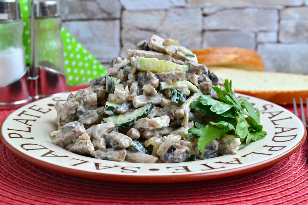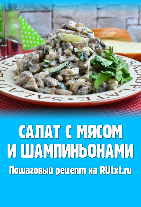 Салат с мясом и шампиньонами, благодаря отличному сочетанию ингредиентов, получается сытным и вкусным. Для более насыщенного и острого вкуса, свежий огурец можете заменить маринованным или соленым. Я готовила блюдо с обычными шампиньонами, можно - с лесными грибами, которые предварительно нужно отварить. Приготовьте этот мясной салат с грибами и он, наверняка, придётся вам по вкусу.