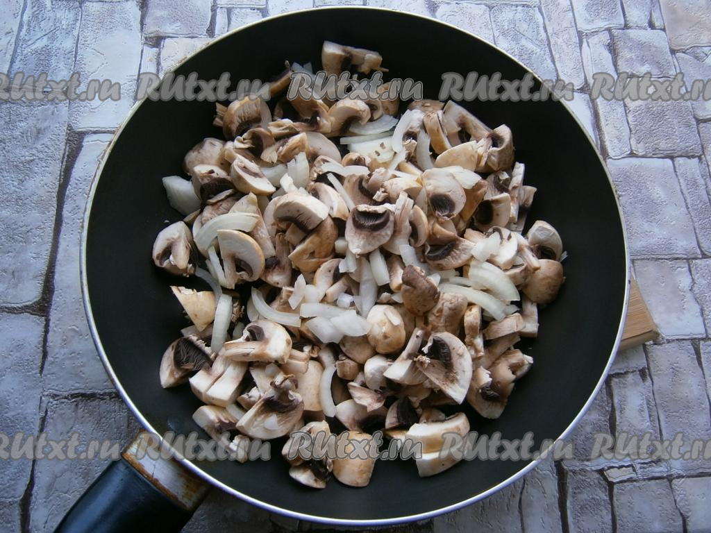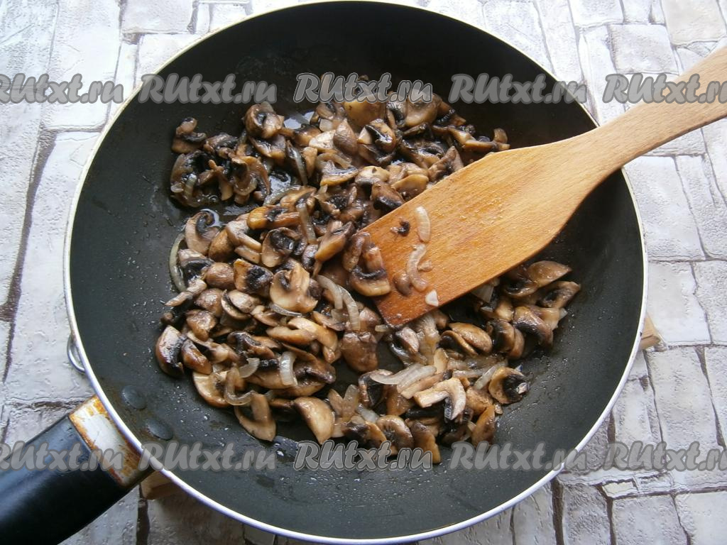 Жарить грибы с луком, помешивая, на среднем огне около 7-8 минут. Затем остудить шампиньоны, обжаренные с луком.