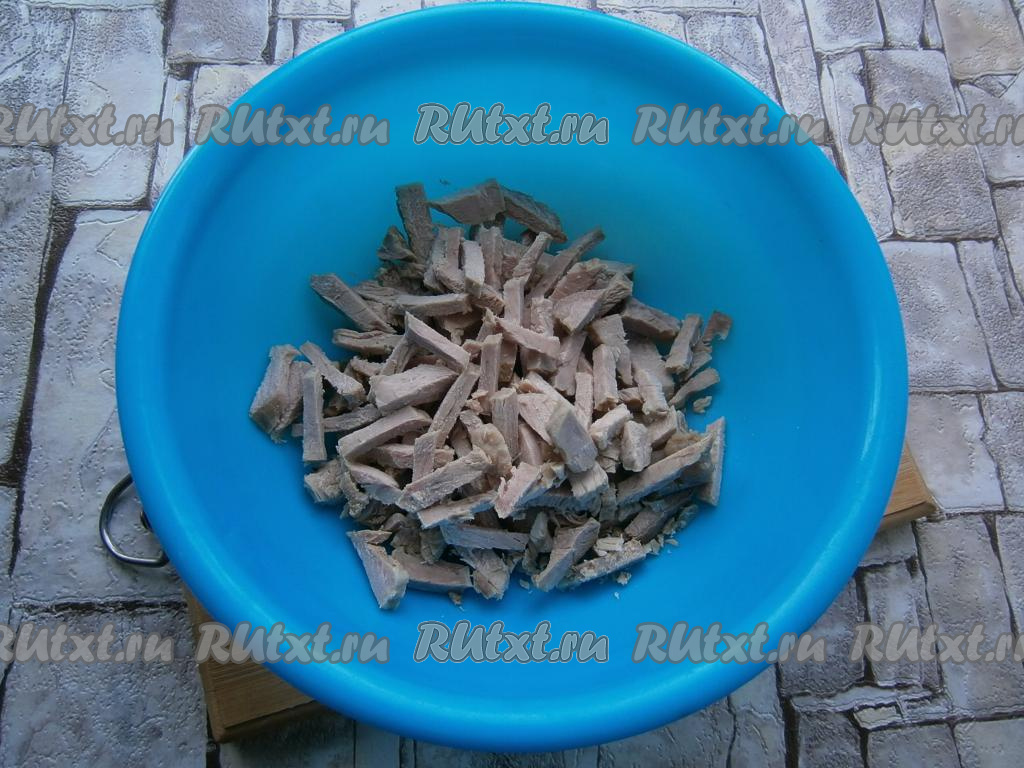Свинину отварить в подсоленной воде на медленном огне в течение 1,5 часов с момента закипания. Вареную свинину остудить и нарезать длинными кусочками.