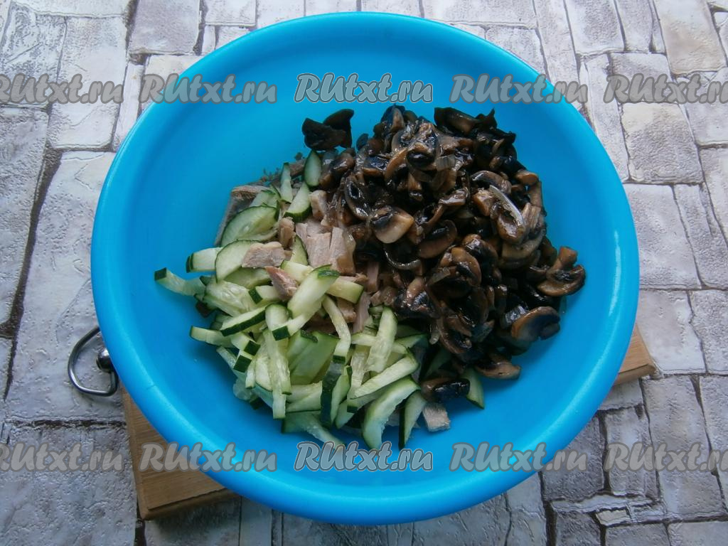 К нарезанному мясу добавить остывшие шампиньоны с луком, нарезанный брусочками огурец.