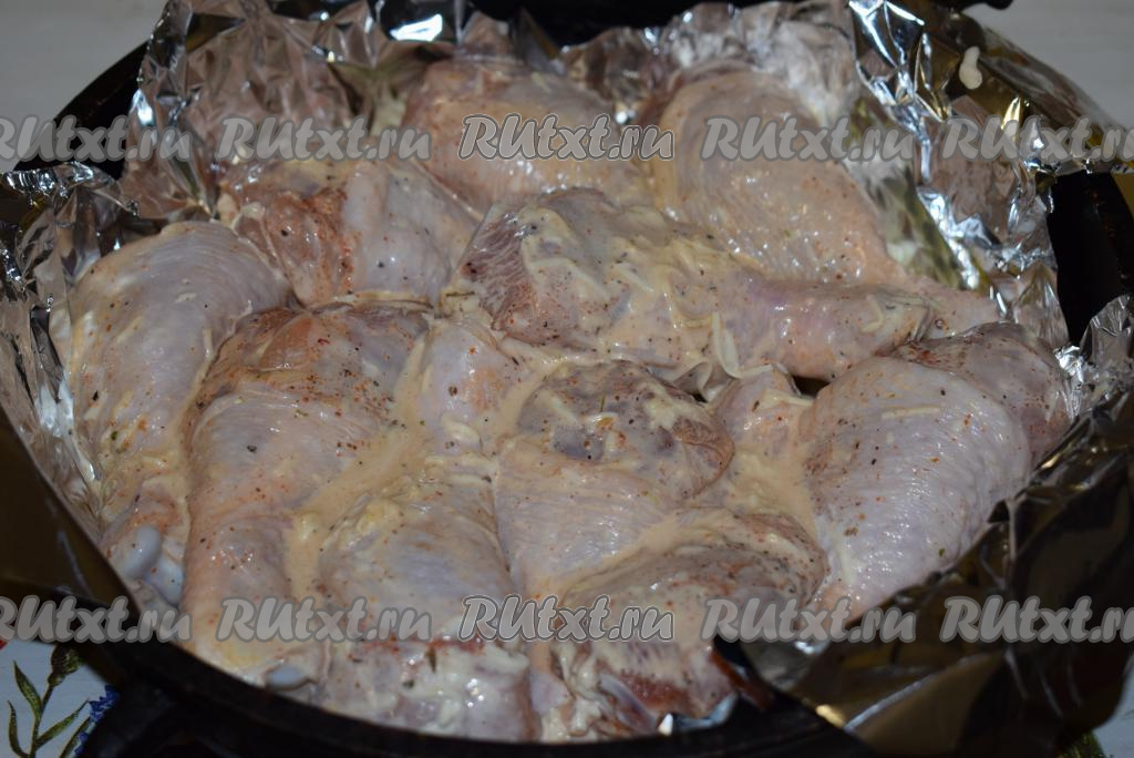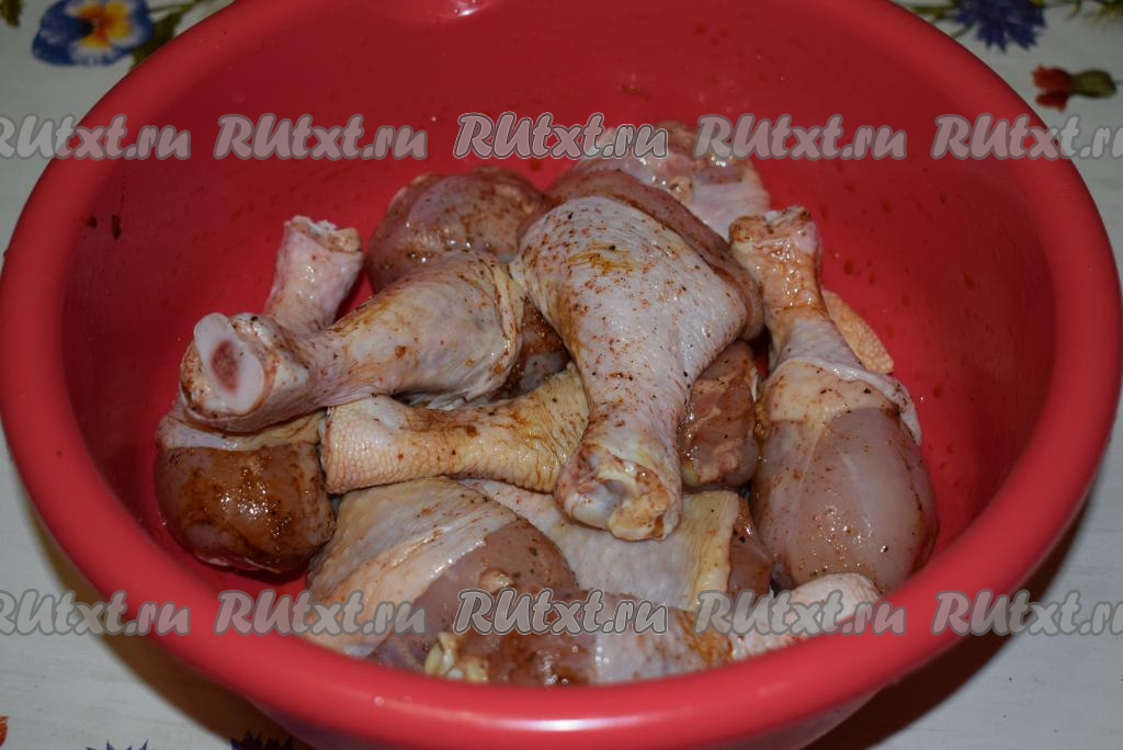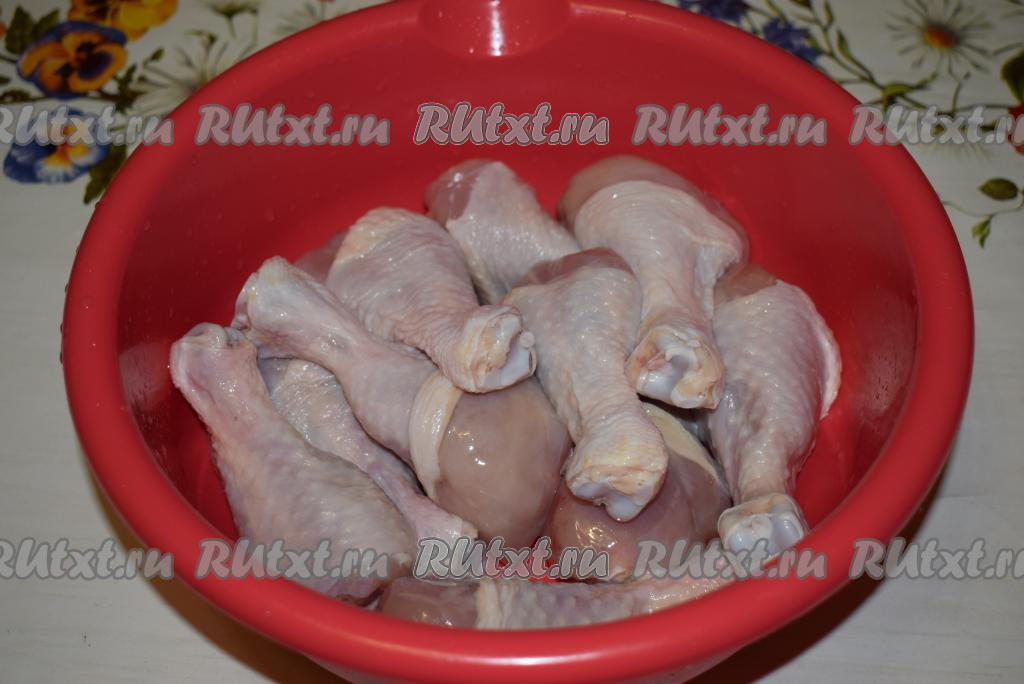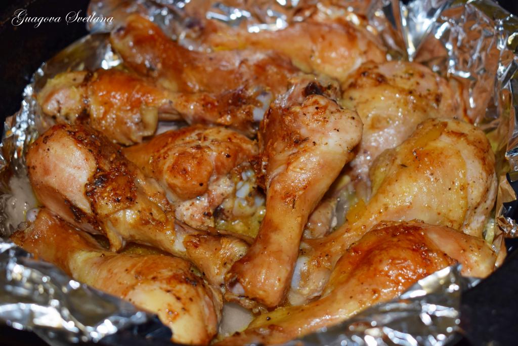 Форму для запекания застилаем фольгой или пергаментом, выкладываем куриные ножки, отправляем в разогретую духовку и запекаем 1 час при температуре 180 градусов.