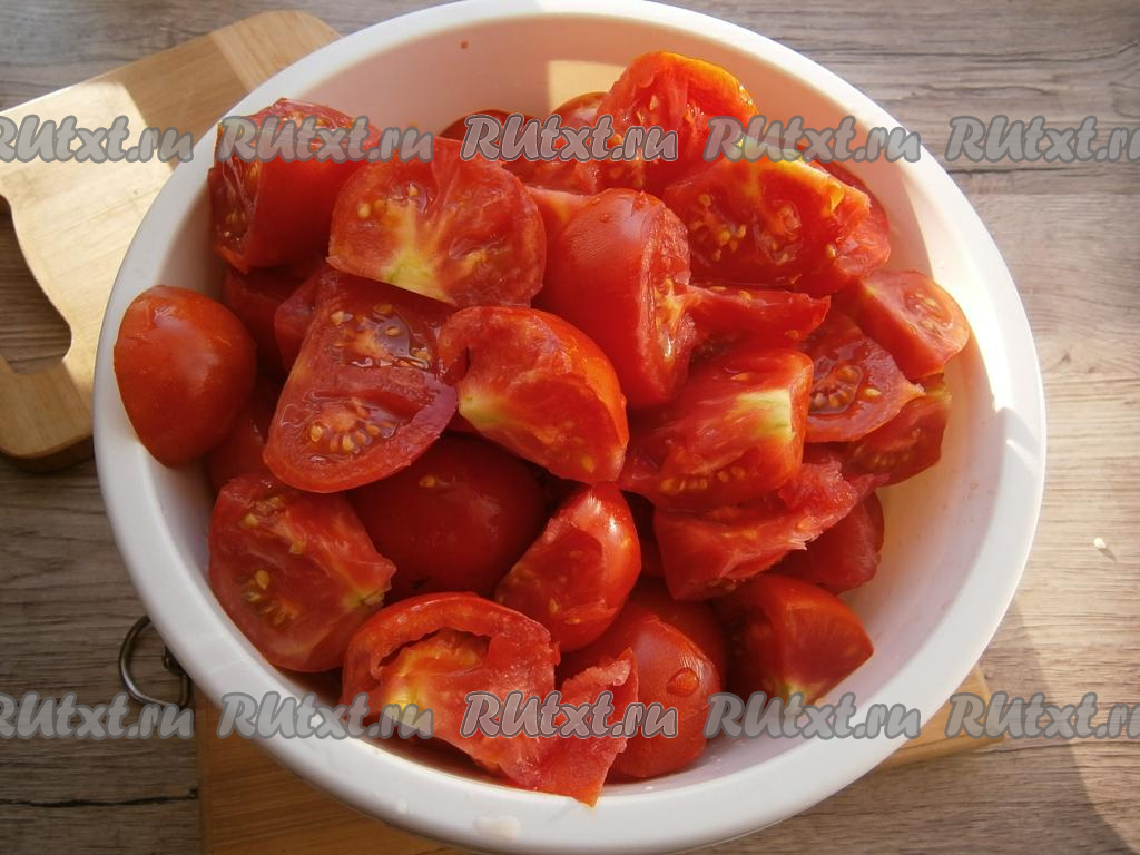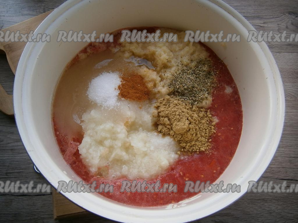Помидоры перекрутить на мясорубке с мелкой решеткой или измельчить блендером. Томат вылить в чашу мультиварки.