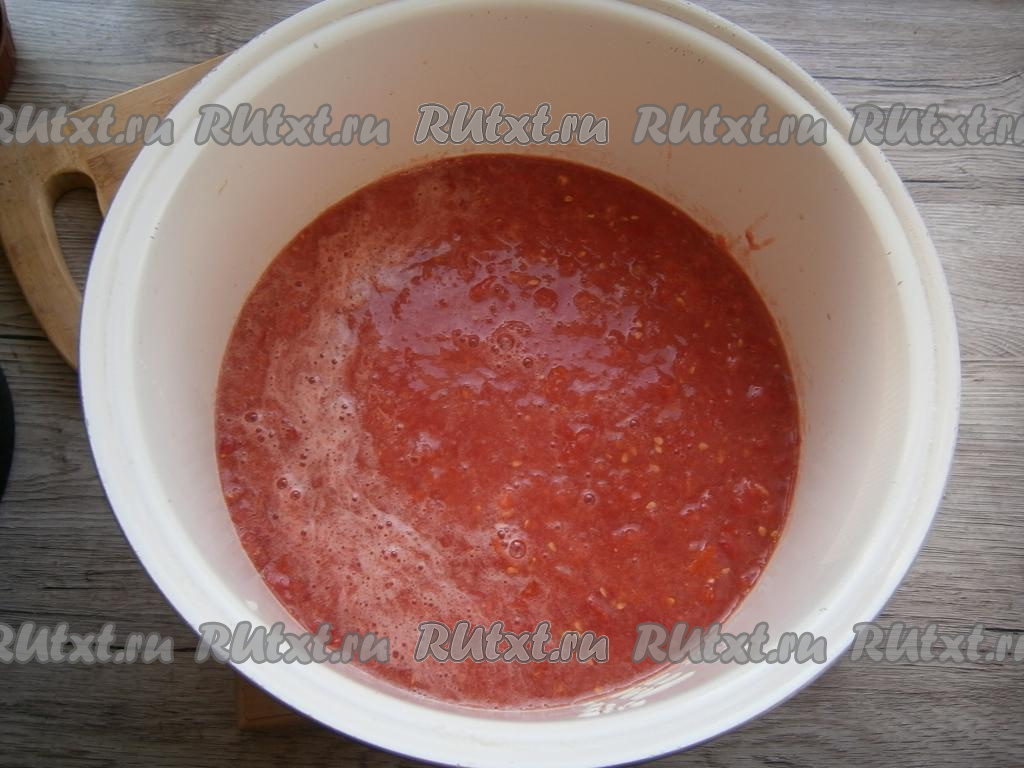 Выставить программу "Выпечка" на 45 минут, крышку мультиварки закрыть. Затем перетереть готовый томат через сито. Жидкий сок вылить обратно в чашу мультиварки, а гущу измельчить погружным блендером до однородного состояния.