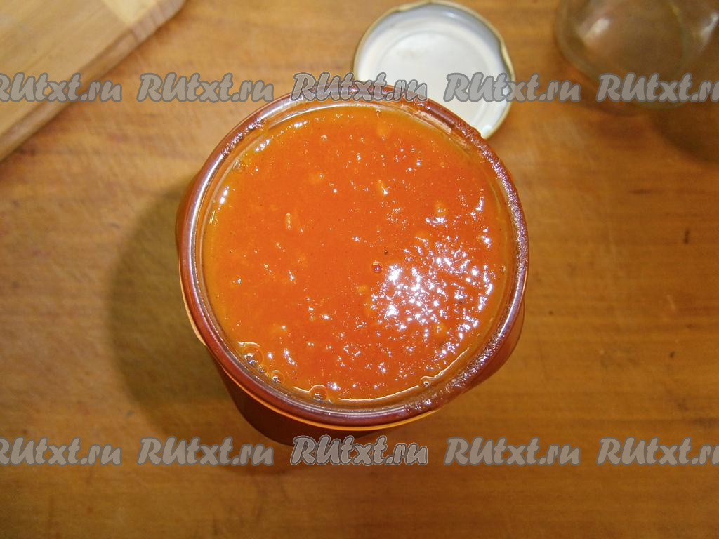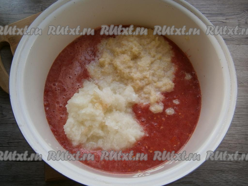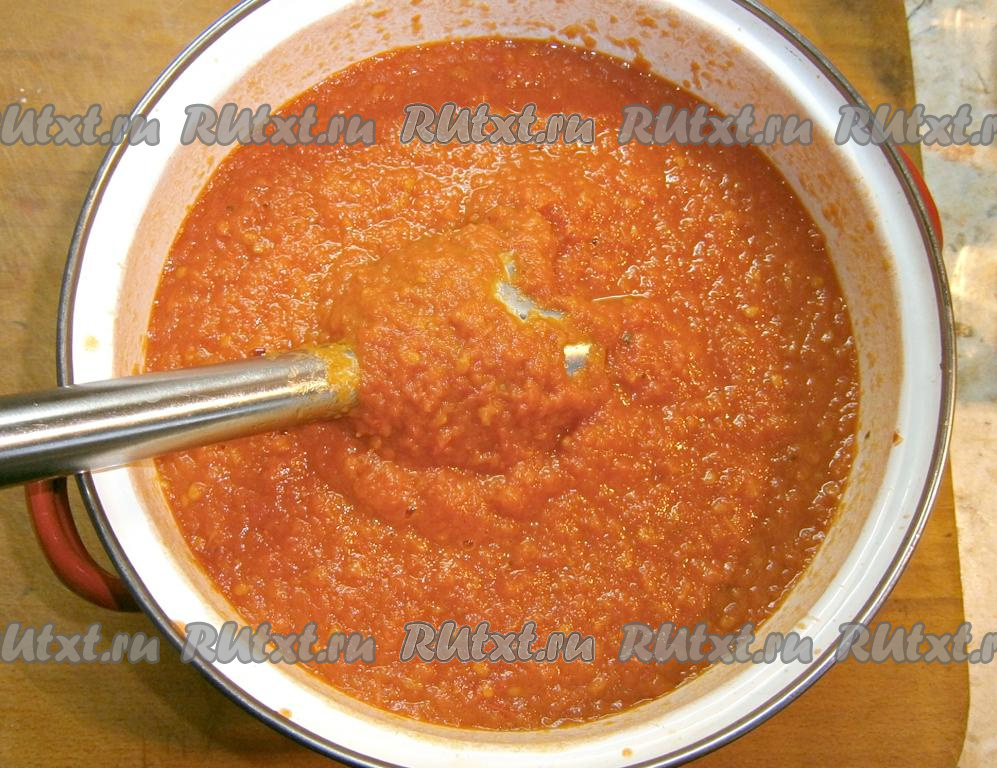 Добавить в томат перекрученные на мясорубке или измельченные в пюре блендером лук и болгарский перец.