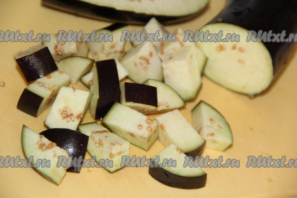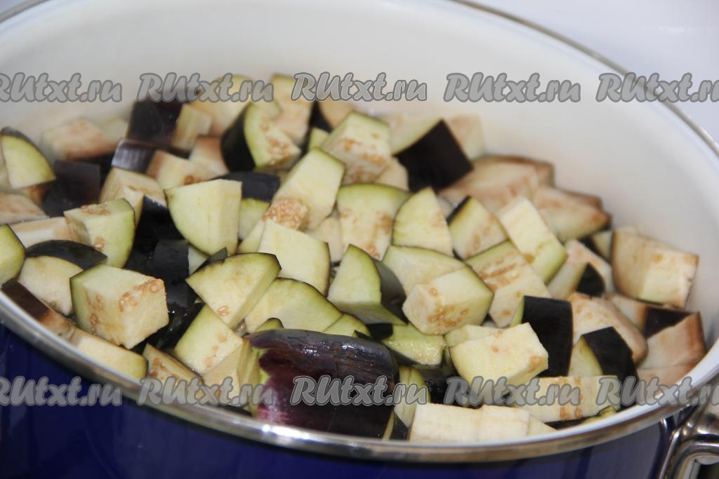 В большой кастрюле вскипятить воду, посолить по вкусу. Опустить кусочки баклажанов в кипящую воду, довести до кипения и, уменьшив огонь, варить 10 минут, помешивая и утапливая баклажаны в воду.