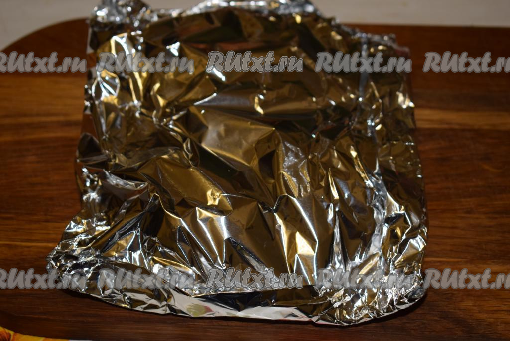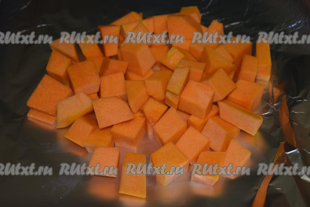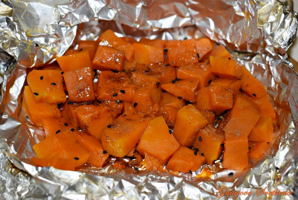 Тыкву очистить от шкурки и нарезать на кубики, примерно, равного размера. Нарезанную тыкву выложить на фольгу (из фольги мы будем делать конверт, так что берите достаточное количество фольги).