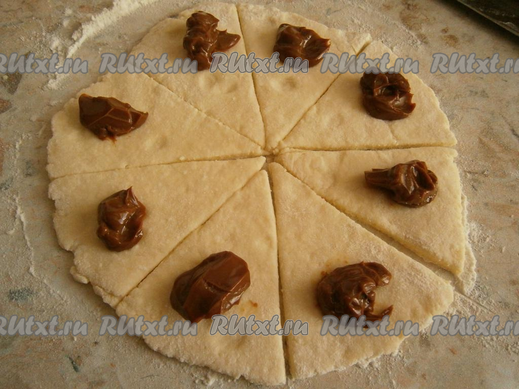 Далее тесто нужно разделить на 2 части. На столе, присыпанном мукой, каждую часть теста раскатать в лепешку толщиной около 0,5-1 см, разрезать на 8 сегментов. На край каждого сегмента поместить по чайной ложке начинки из вареной сгущенки, повидла или выложить по несколько свежих ягод или фруктов.