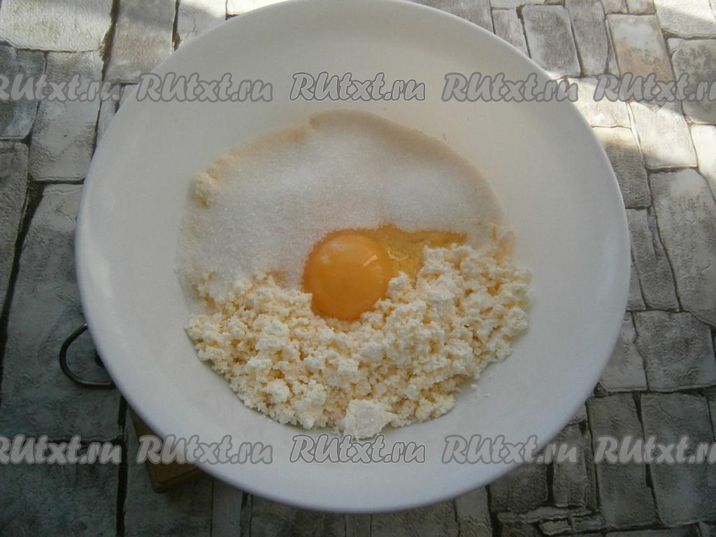 К творогу добавить сахар, соль и сырое яйцо.