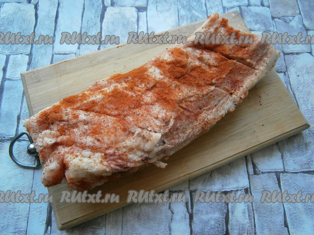 Натереть пузанину солью, черным молотым перцем и посыпать паприкой.