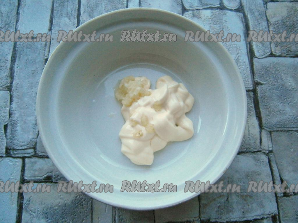 К майонезу добавить пропущенный через пресс чеснок, хорошо перемешать получившийся соус.