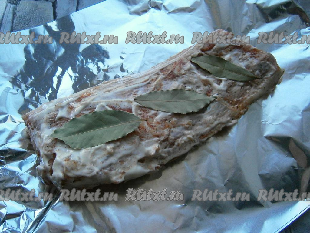 Смазать пузанину со всех сторон приготовленным соусом и выложить её на сложенный вдвое кусок фольги. Поверх куска сала с мясом выложить лавровые листья.