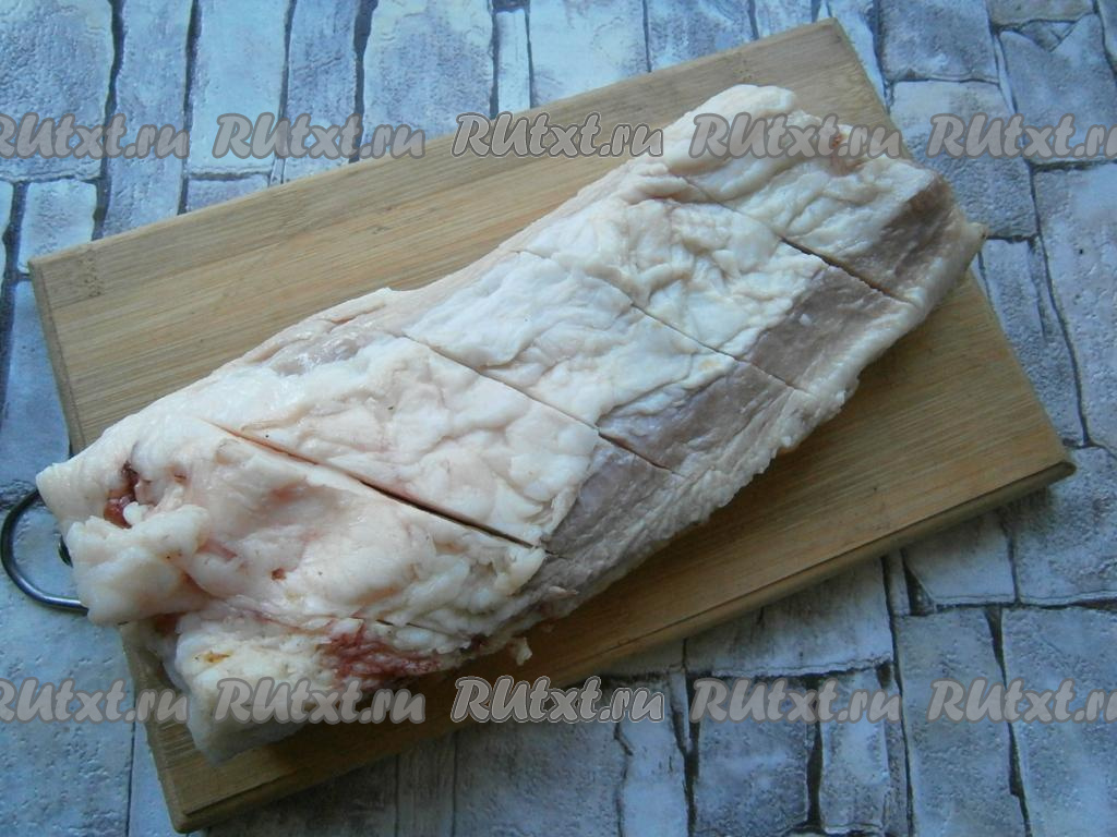 Пузанину вымыть, шкуру поскоблить, обсушить бумажными салфетками. На поверхности сала (со стороны, где нет шкуры) сделать 4-5 глубоких надрезов (как на фото).