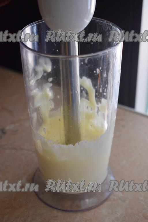 Взбиваем яйца погружным блендером, поднимая и опуская насадку блендера, до побеления ингредиентов (примерно, 1 минуту).