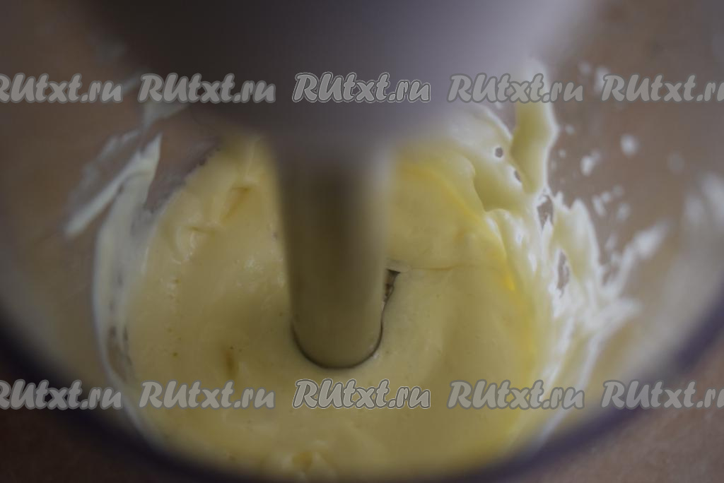Далее, не прекращая взбивать, добавляем к смеси по 1 столовой ложке растительного масла. Взбиваем до загустения майонеза, примерно, 7-8 минут в общей сложности.