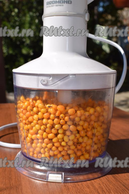 Оставить облепиху на пару минут в дуршлаге, чтобы стекла лишняя влага. Затем пересыпать ягоды в чашу блендера.
