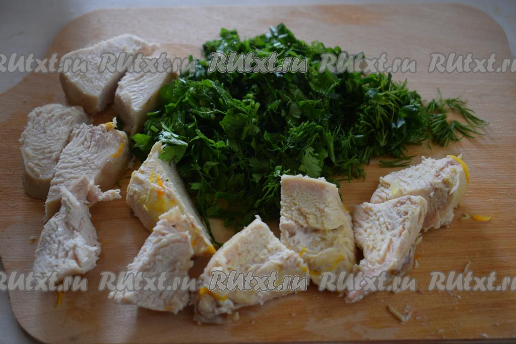 Достаем из супа мясо и делим его на порционные кусочки. Зелень нарезаем мелко.