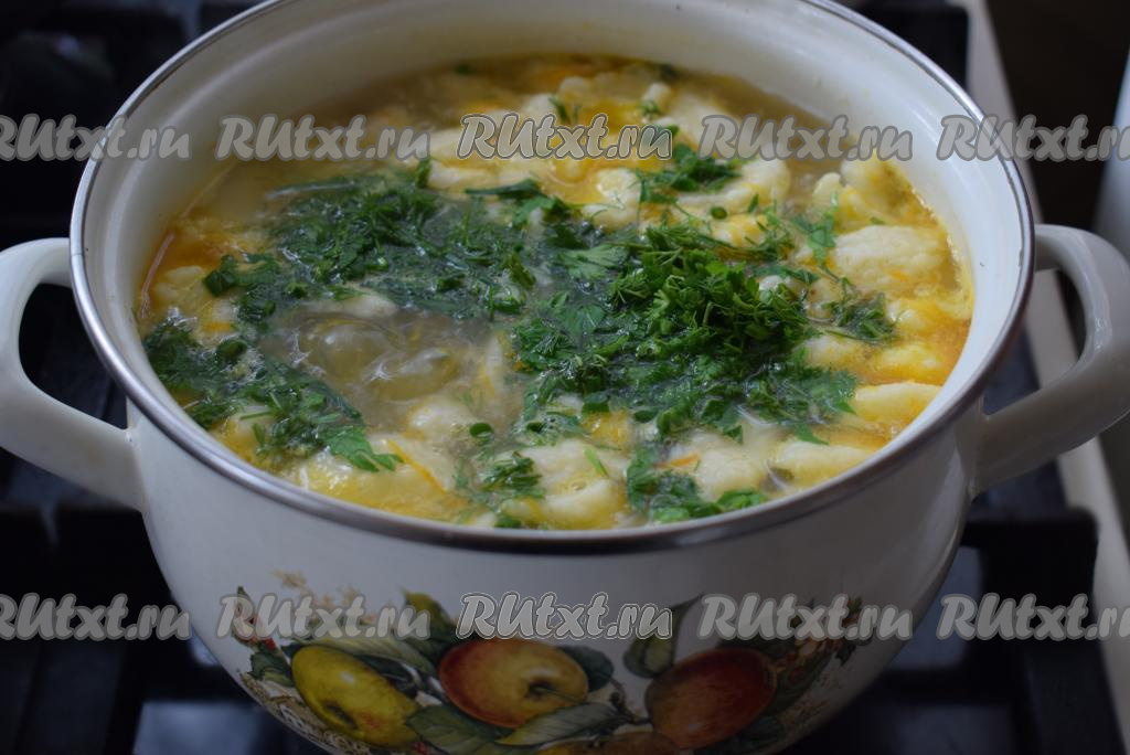 Добавляем в суп курицу и зелень, доводим до кипения, снимаем с огня.