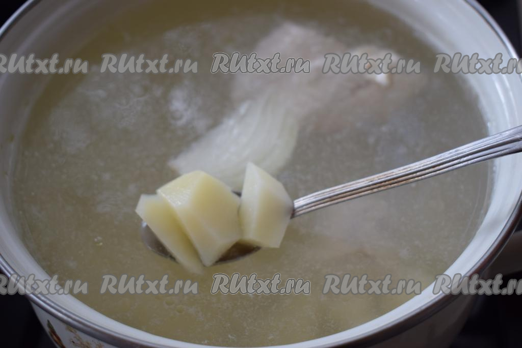Когда куриное мясо сварится, достаём из бульона луковицу (она больше не понадобится). Добавляем в бульон с мясом нарезанный картофель и варим до готовности картошки (примерно, 20 минут с момента закипания, продолжительность варки зависит от сорта картофеля).