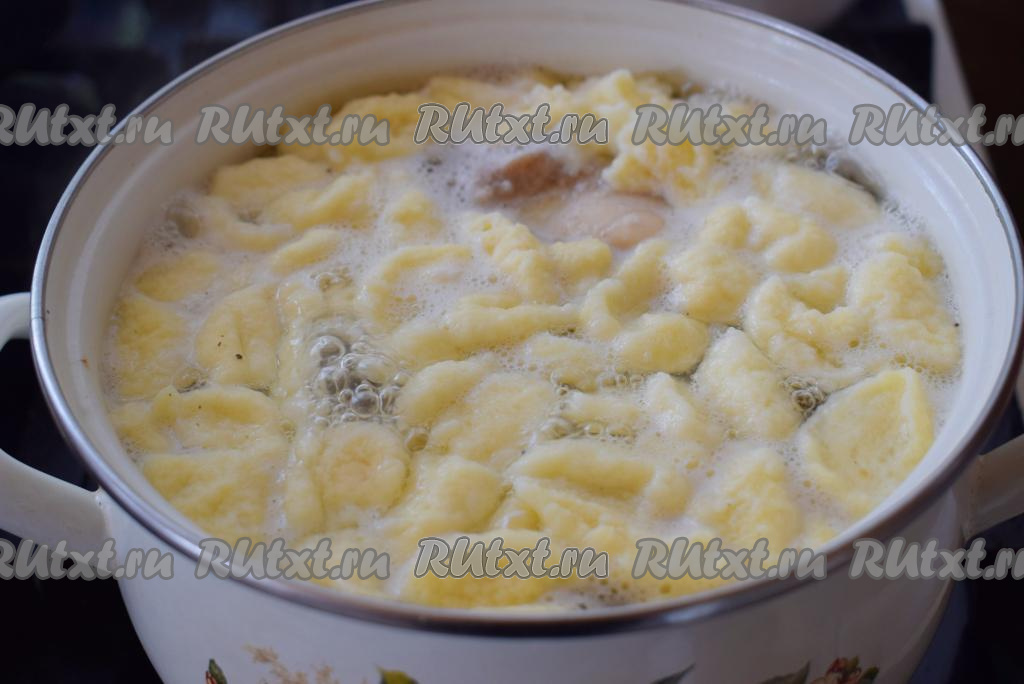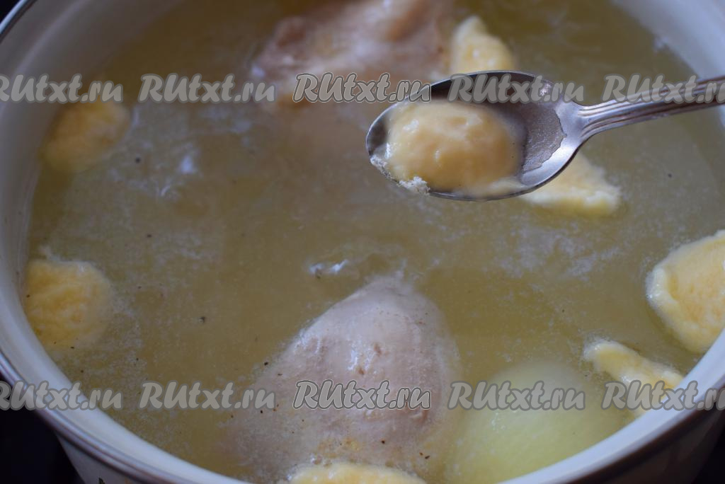 Когда картофель сварится, добавляем в куриный суп по половине чайной ложки теста для галушек, обмакивая ложку каждый раз в кипящий суп (благодаря обмакиванию ложки в суп, тесто будет легко отделяться от ложки).