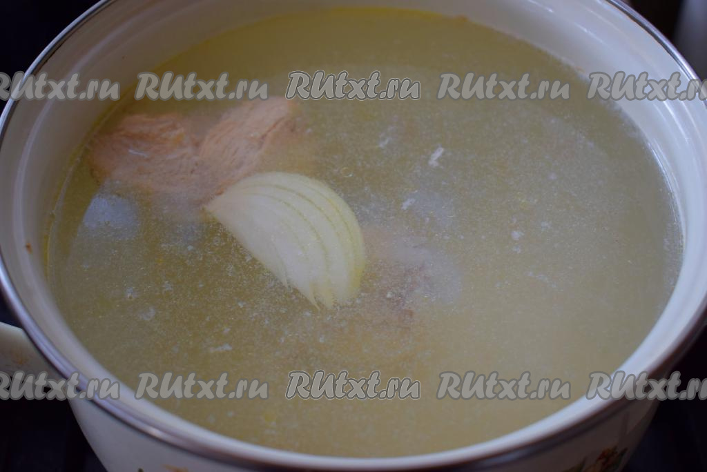В кастрюлю наливаем холодную воду, добавляем куриное мясо и очищенный лук, разрезанный на 4 части. Ставим кастрюлю на огонь, доводим до кипения и варим бульон до готовности курицы (примерно, 30-40 минут).