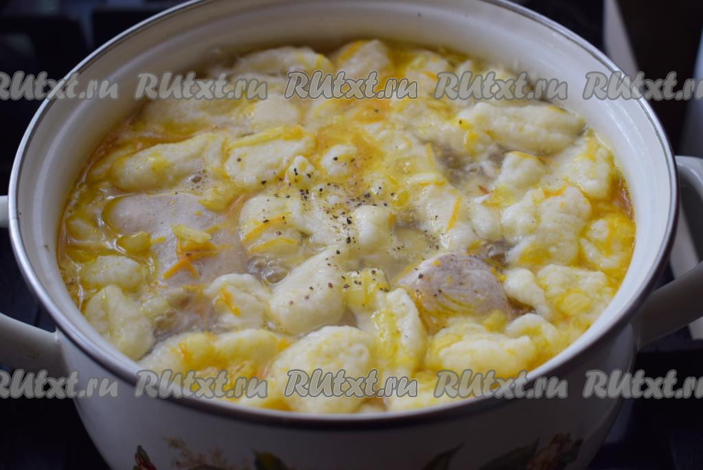 Когда все галушки будут добавлены, даем куриному супа провариться, примерно, 7-8 минут с момента закипания на небольшом огне. Солим, перчим наш суп и добавляем любимые специи.