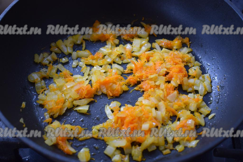 Пока варится бульон, приготовим зажарку, для этого очистим лук и морковь. Лук мелко нарежем, а морковь натрем на крупной терке. В сковороде разогреем растительное масло, добавим лук с морковью и обжарим их, иногда помешивая, до прозрачности на слабом огне (примерно, 15 минут), накрыв крышкой.