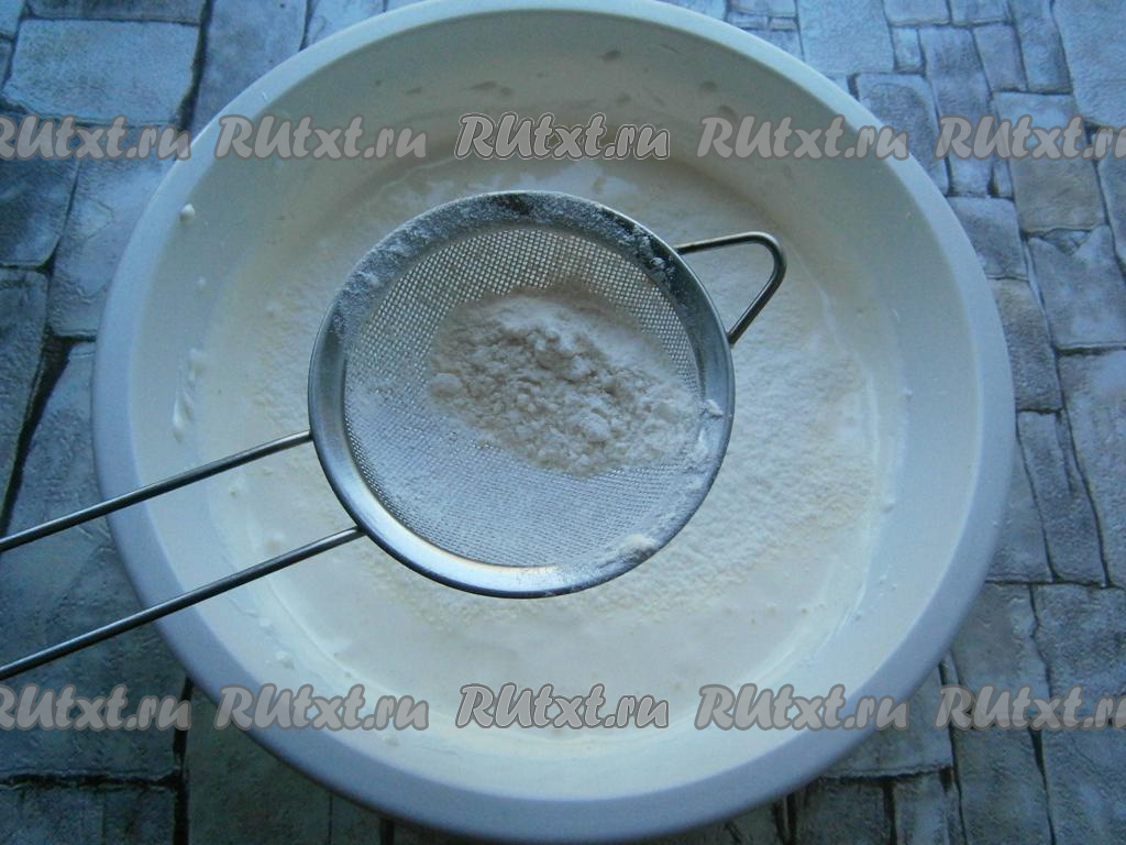 В белково-желтковую массу просеять частями муку, каждый раз аккуратно ее вмешивая в тесто. Муку вмешивать деревянной или пластиковой ложкой!