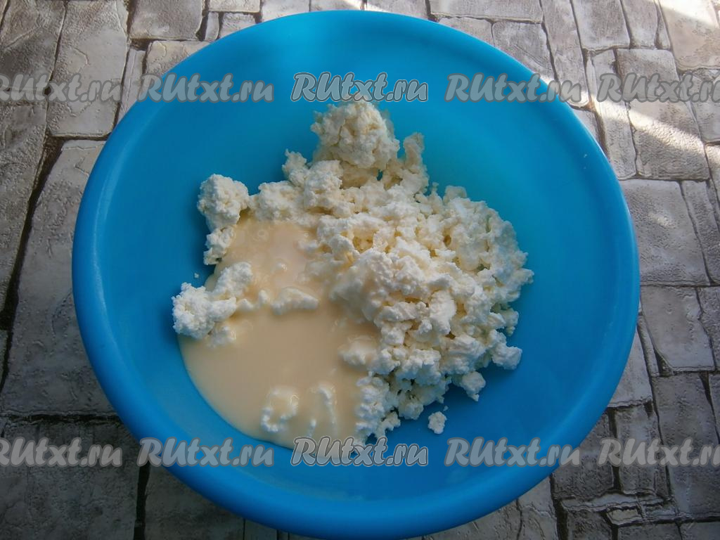 В отдельную ёмкость выложить творог, добавить сгущенное молоко.