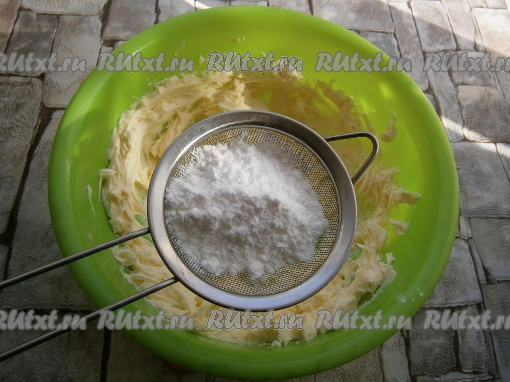 Взбить масло миксером до светлого, пышного состояния. Просеять в масло сахарную пудру, добавить ванилин, перемешать масляную смесь на низких оборотах миксера.
