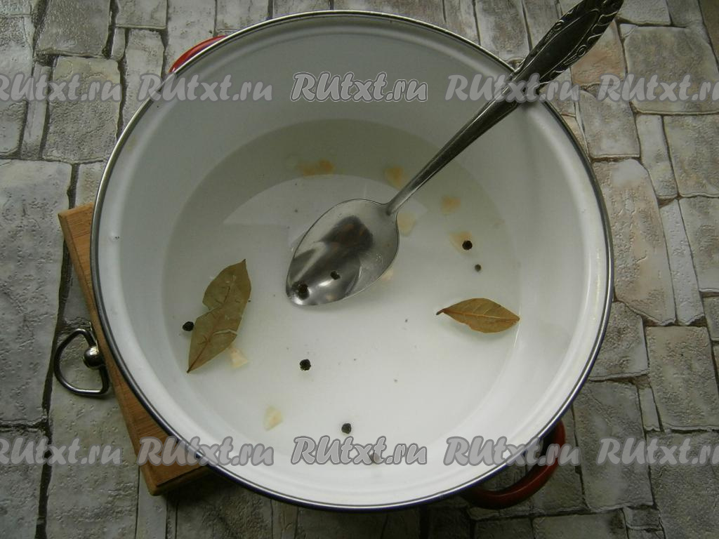 В кастрюльку налить воду, добавить сахар, соль, лавровые листья, горошины черного перца, нарезанный чеснок, влить уксус, поставить на огонь и довести маринад до кипения.