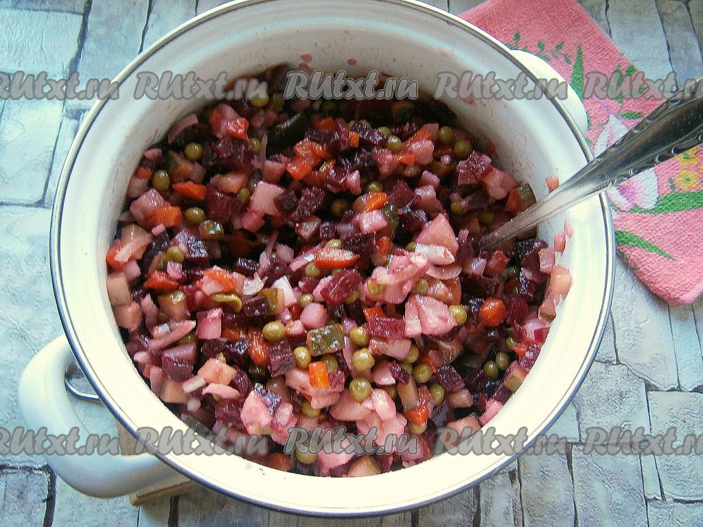 Тщательно винегрет перемешать и дать ему настояться в прохладном месте часа 2.