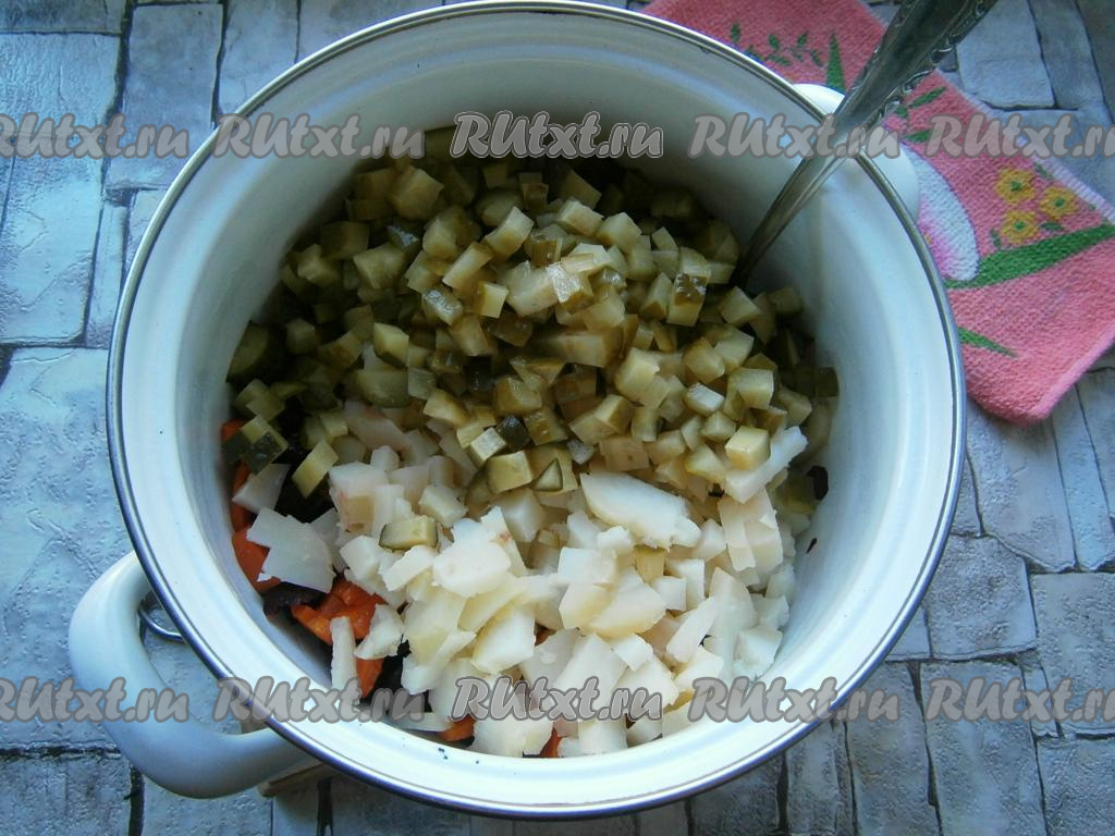 Далее добавить нарезанные кубиками картофель и соленые огурчики.