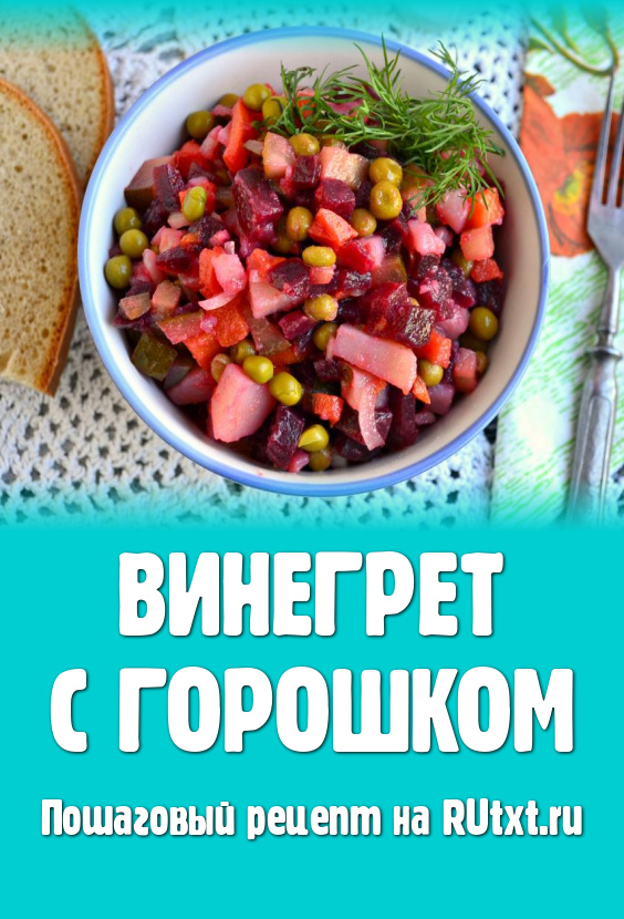 Влить заправку в винегрет, добавить консервированный горошек и соль.