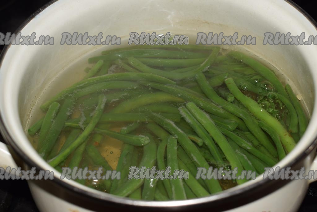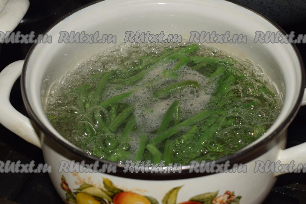 В кастрюле кипятим воду, подсаливаем ее и опускаем подготовленную фасоль (фасоль должна быть полностью покрыта водой).
