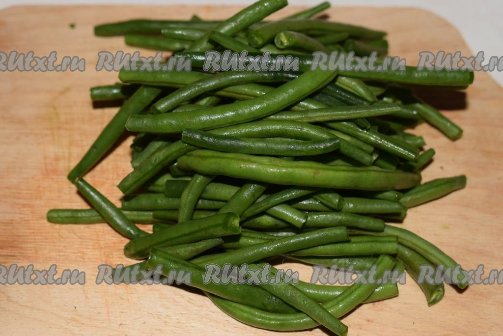 Обрежем кончики с каждого стручка фасоли с двух сторон. Если стручки очень длинные, их можно разрезать на 2-3 части.