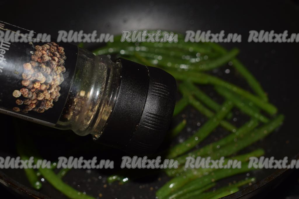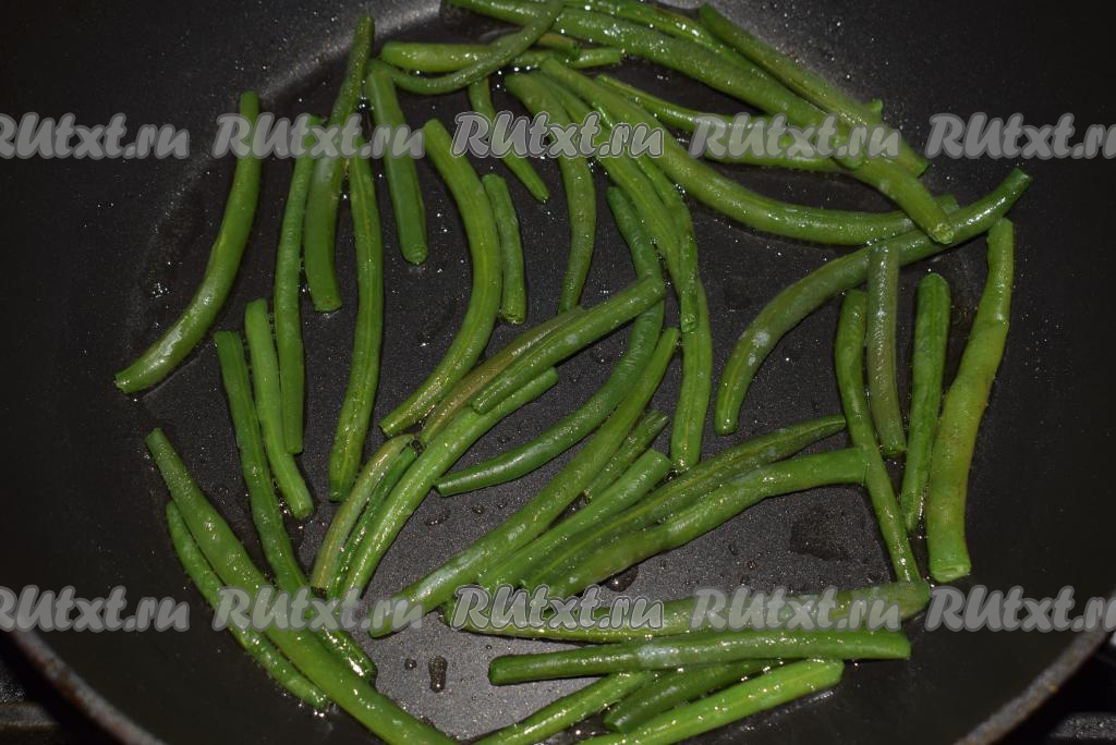 В сковороде разогреваем растительное и сливочное масла. Добавляем в сковороду фасоль и жарим на среднем огне до готовности стручков (около 5 минут).