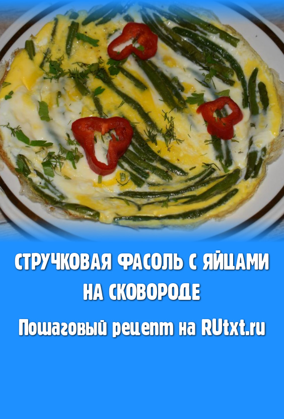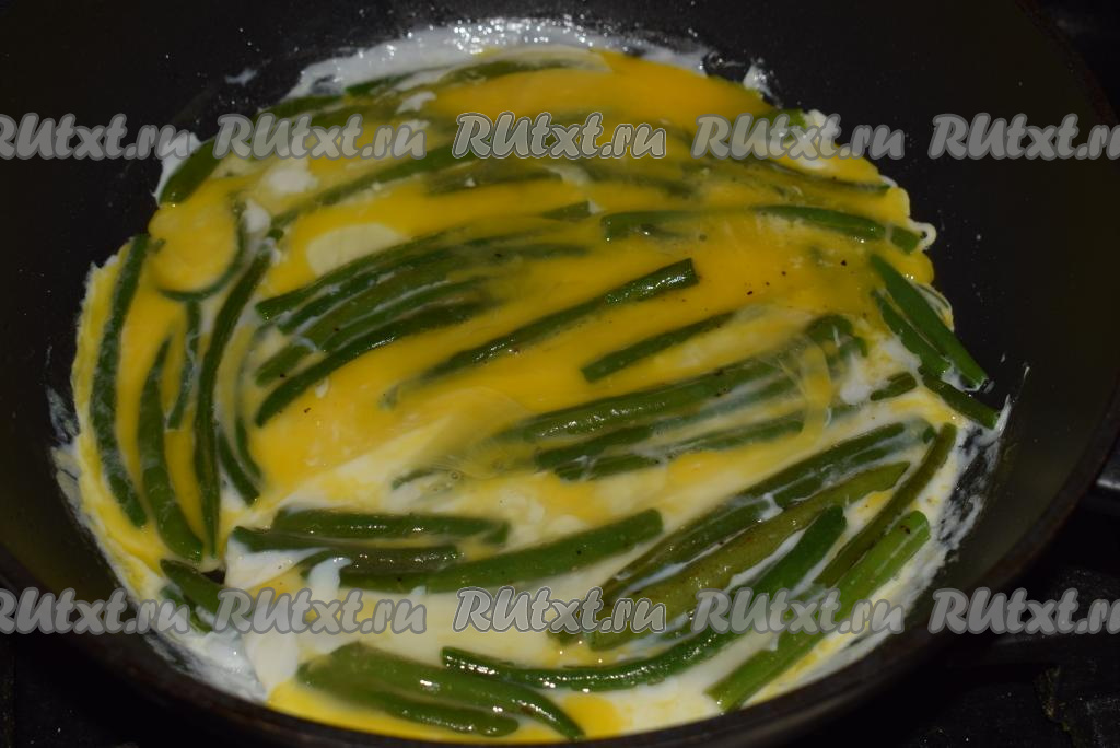 К обжаренной стручковой фасоли вбиваем яйца и распределяем их по всему периметру сковороды, накрываем крышкой и даем блюду протомиться на среднем огне около 3-4 минут (до готовности яиц).