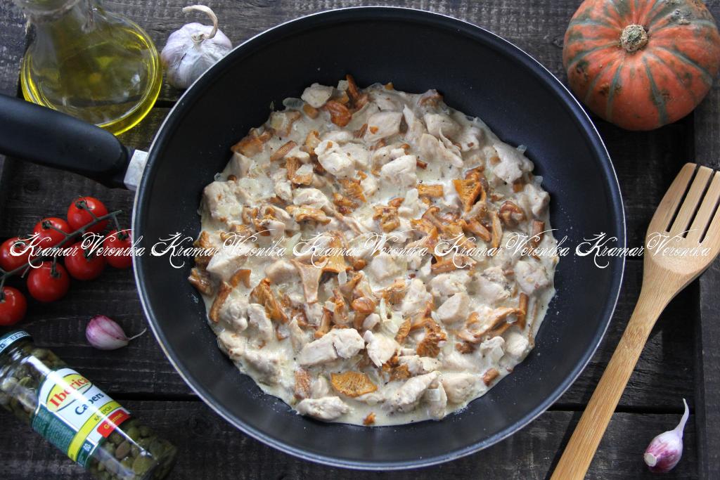 Вкусное, сочное, ароматное куриное филе, приготовленное с лисичками в сметане, подать к столу с любым гарниром.